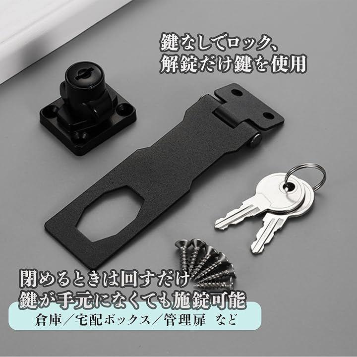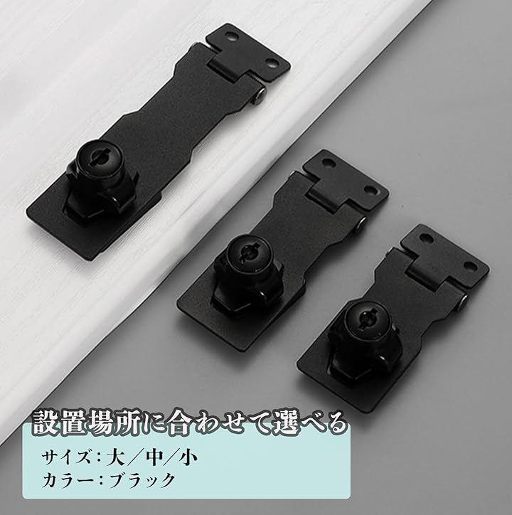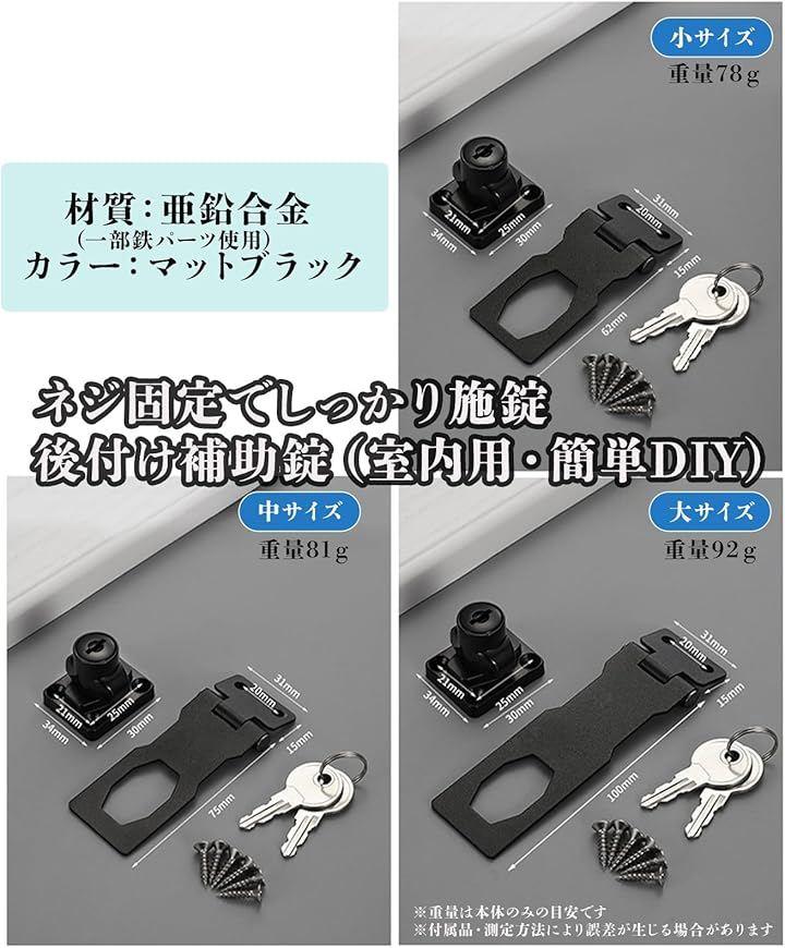 「商品詳細」 サイズ:大・中・小 素材:ステンレス カラー:ブラック 内容物:補助錠2個・鍵4本(各補助錠専用)