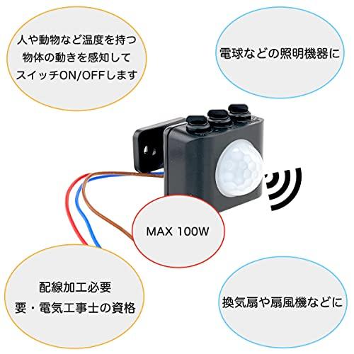通常1-5営業日で発送:【製品概要】すでに設置されている照明機器などをセンサー化したい時に便利な、後付けの人感センサーユニットです。電源と機器の間に配線し、いろいろな電気製品を人感センサー化することができます。小型軽量、大きさは全長60mm x 全幅45mm x 全高40mmと非常に小さく、重さもわずか28グラム。設置後も人感センサーが設置されていることをあまり意識せずにすみます。例えば玄関の照明に、トイレの照明や換気扇に、廊下や階段の照明に、いろいろな所を人感センサー化することができるDIY部品です。【搭載しているセンサー】本製品はPIR人感センサーとCDS照度センサーの両方を搭載しています。そのため、周囲の明るさと人の動きの両方を感知してON/OFFします。【対応する機器とケーブル】AC100V、消費電力100Wまでの照明機器や家電に対応します。配線ケーブルはAWG20 (0.5sq)で、傷に強いテフロンコートを施しています。配線ケーブルの長さは約120mmです。【感知照度調整】LUXノブで、通電する周囲の環境照度を約10ルクスから2000ルクスの間に調節可能。明るくても通電させたい、もしくは暗くなっ