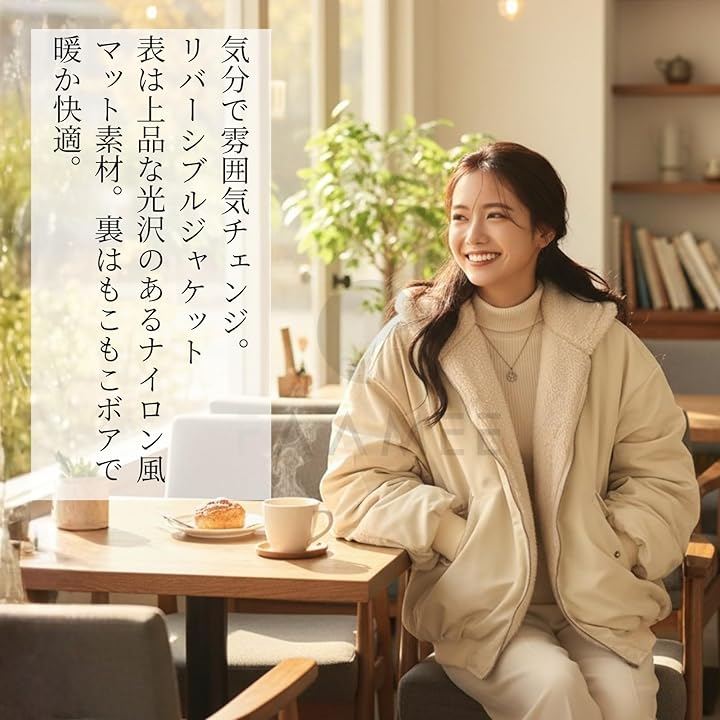 1枚で2通りの印象を楽しめるリバーシブルデザイン ふんわり包まれるようなあたたかさと、着こなしの幅広さを兼ね備えたリバーシブルボアブルゾン。