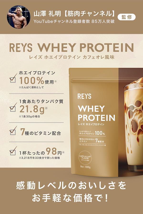 【おいしい・溶けやすい・お手頃価格】YouTube登録者数95万人突破!山澤礼明監修のREYSより待望のホエイプロテイン(WPC)が誕生!おいしさにこだわり、原料の選定・試作を繰り返し、味・溶けやすさ・お求めやすさを実現したプロテインが完成しました。水で美味しくお召し上がりいただけます。 【目指したのは毎日飲みたくなるおいしさ】■カフェオレ風味:コロンビア産のアラビカ種コーヒー豆からドリップ製法で抽出したこだわりのコーヒーエキスを使用。クリーミーでほっとする甘さ。 【厳選されたホエイプロテイン100%使用】たんぱく原料として吸収スピードの速いホエイプロテインを100%使用。1食(製品30g)あたりタンパク質21.8g。さらに毎日に欠かせない7種類のビタミン(V.B1,V.B2,V.B6,V.C,V.D,ナイアシン,パントテン酸)を配合。 【お召し上がり方】付属のスプーン3杯(約30g)を目安に、200mlの冷たい水などに溶かしてお召し上がりください。 【おすすめの摂取タイミング】目安:1日2回?3回 ■運動前後:トレーニング時の栄養補給に ■間食に:手軽にたんぱく質補給!■夜に:1日の終わりのたんぱく質補給に