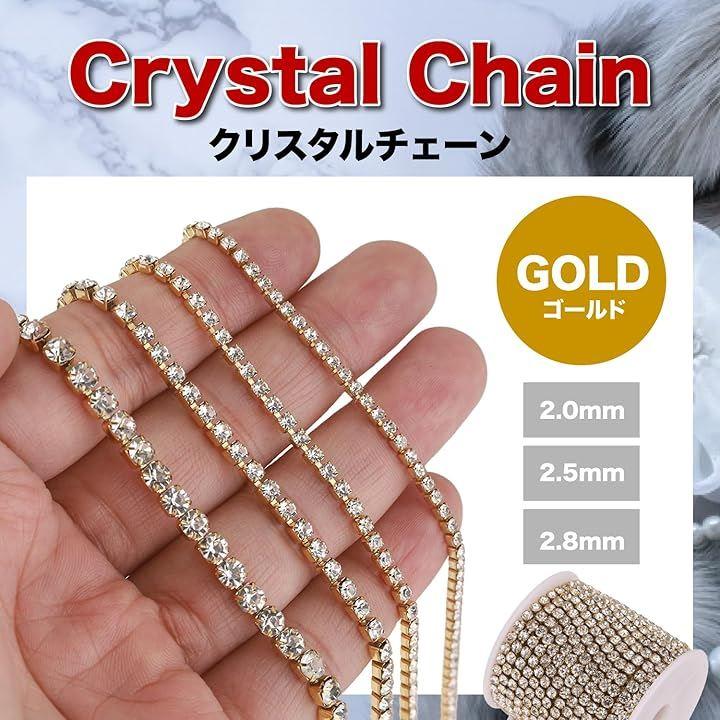 「バリエーション」 2.0mm / 2.5mm / 2.8mm 「商品詳細」1ロール10m / ストーンサイズ:2.0mm / 2.5mm / 2.8mm / 1mにつき約400粒 / 約340粒 / 約300粒 / 材質:真鍮(チェーン)、ガラス(ストーン) / カラー:ゴールド