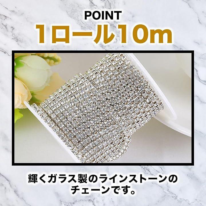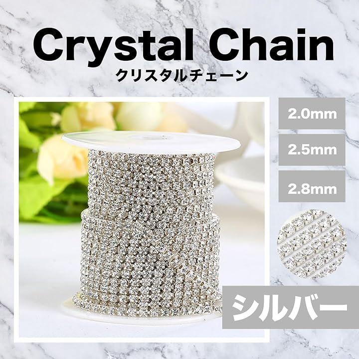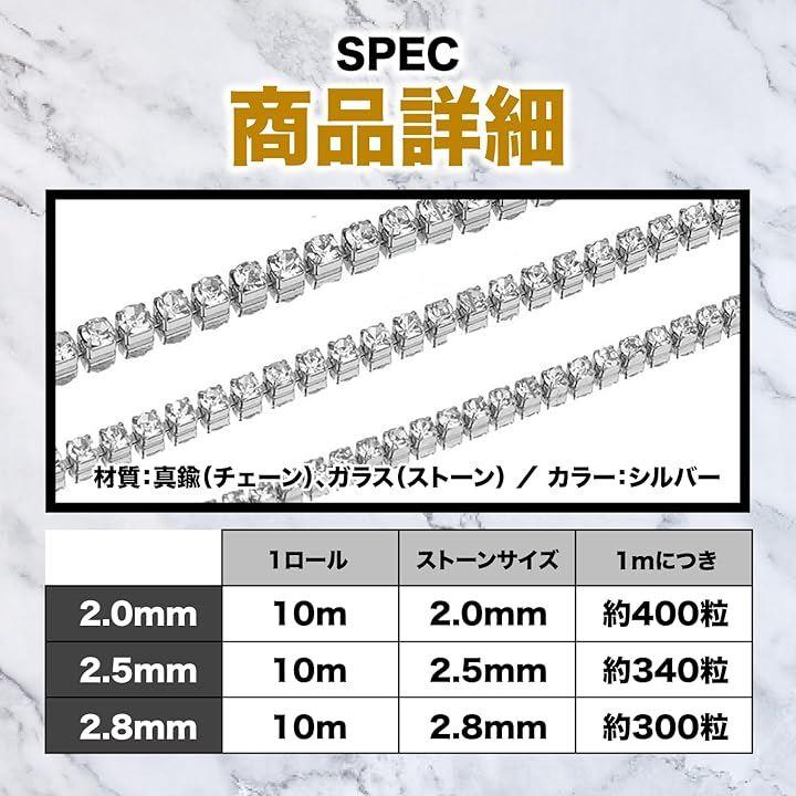 「バリエーション」 2.0mm / 2.5mm / 2.8mm 「商品詳細」1ロール10m / ストーンサイズ:2.0mm / 2.5mm / 2.8mm / 1mにつき約400粒 / 約340粒 / 約300粒 / 材質:真鍮(チェーン)、ガラス(ストーン)