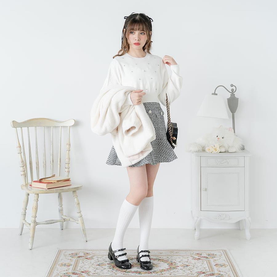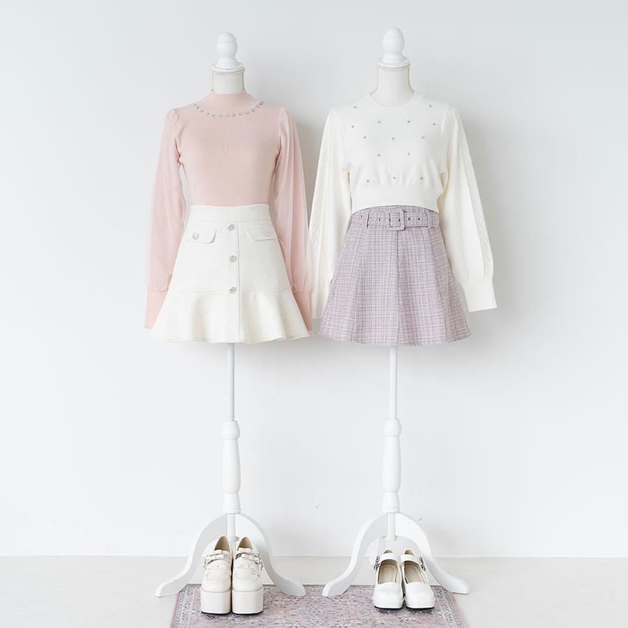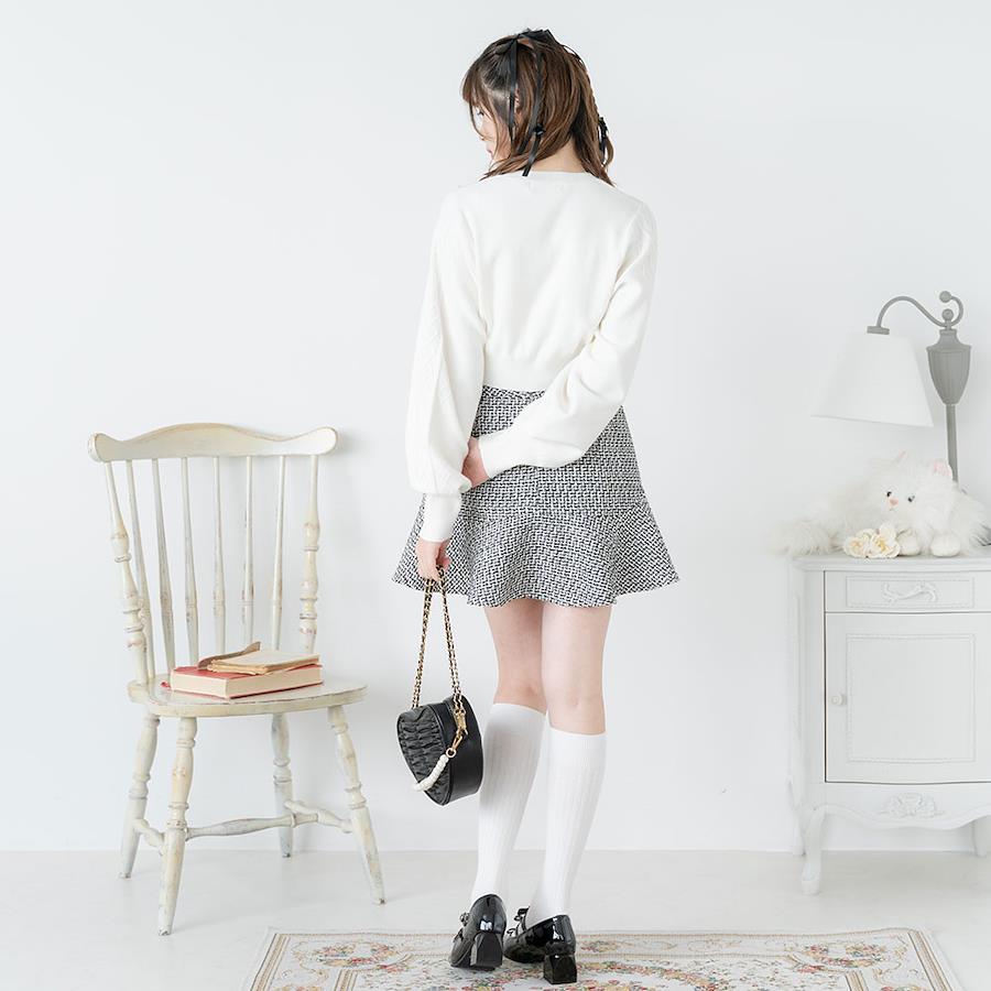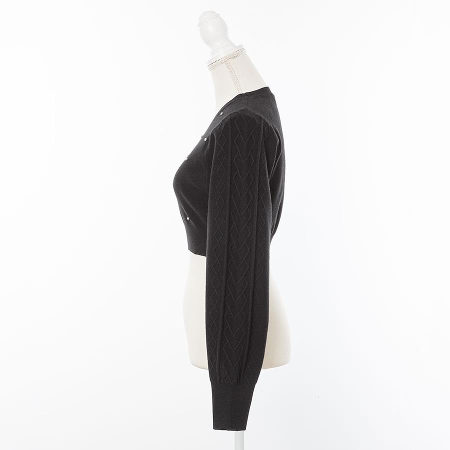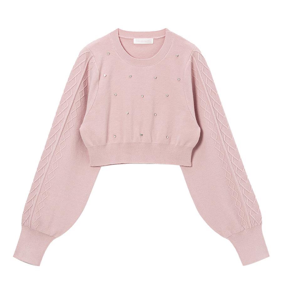 今季大注目のラインストーン付きショート丈ニットトップスのご紹介。【デザイン】きらきらのラインストーンが散りばめられたショートニットトップスです。小さなビジューとコンパクトな丈感がトレンドライクで、着るだけで旬なコーデが完成するアイテム。ぽわっとボリューミーなあざと可愛いお袖にはハートケーブルが施されていて、ガーリーさも忘れない他と差がつくデザインに♪襟元リブはしっかりと伸びるので、被りで楽に着用いただけます。裾リブも少し長めで、ボトムにinしなくてもスタイルUPできちゃうシルエットもポイントです◎1枚でも重ね着でも多様な着方が出来ちゃう着回し抜群なニットです♪