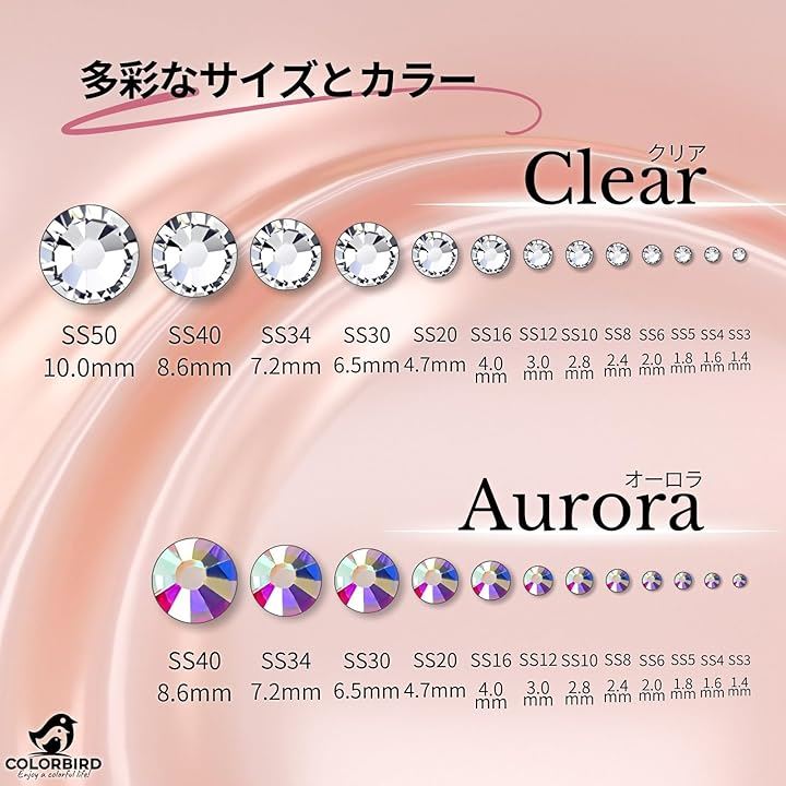 「多彩なサイズとカラー」各種サイズ(SS3,4,5,6,8,10,12,16,20,30,34,40,50など)と豊富なカラーバリエーション(クリアー、オーロラ)を揃えており、あなたのデザインに合わせて自由に選べます。