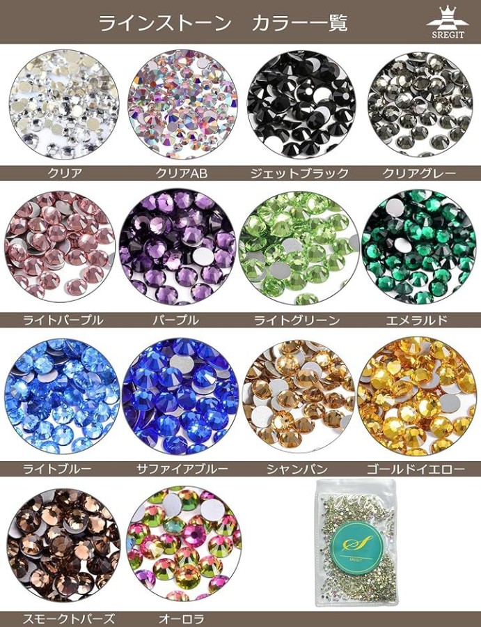 「内容量」:ラインストーン/1カラー・1サイズ(計1300粒以上)「カラー」 クリア / クリアAB / ジェットブラック / クリアグレー / ライトパープル / パープル / ライトグリーン / エメラルド / ライトブルー / サファイアブルー / シャンパン / ゴールドイエロー / スモークトパーズ / オーロラ