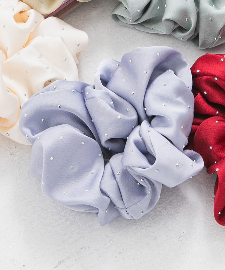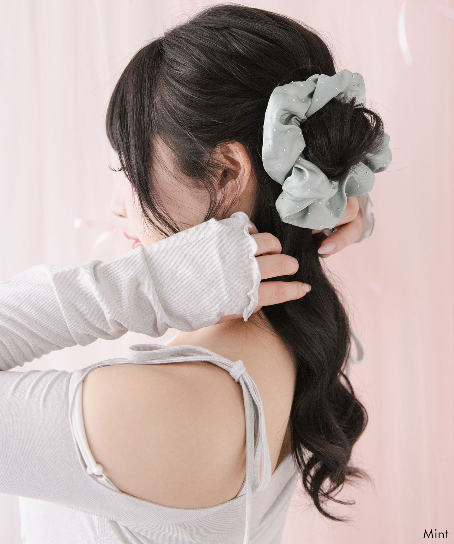 動くたびにきらきら煌めくラインストーンが可愛いサテンシュシュ。
