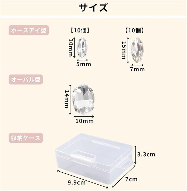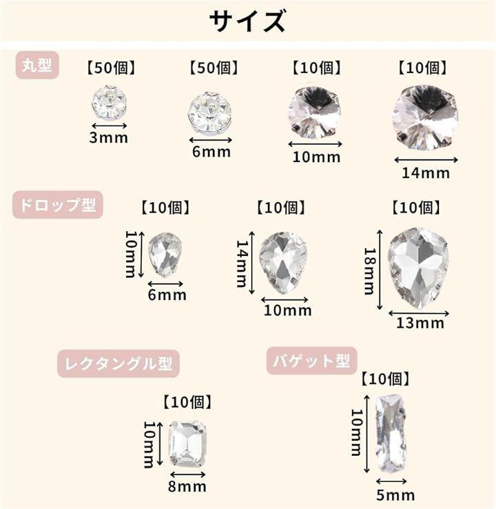《セット内容》「台座付ストーン」丸型:3mm(50個) / 6mm(50個) / 10mm(10個) / 14mm(10個)・ドロップ型:6x10mm(10個) / 10x14mm(10個) / 13x18mm(10個) ・レクタングル型:8x10mm(10個)・バケット型:5x10mm(10個)・ホースアイ型:5x10mm(10個) / 7x15mm(10個)・オーバル型:10x14mm(10個)・「収納ケース」9.9x7x3.3cm(1個)