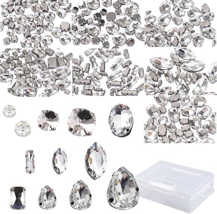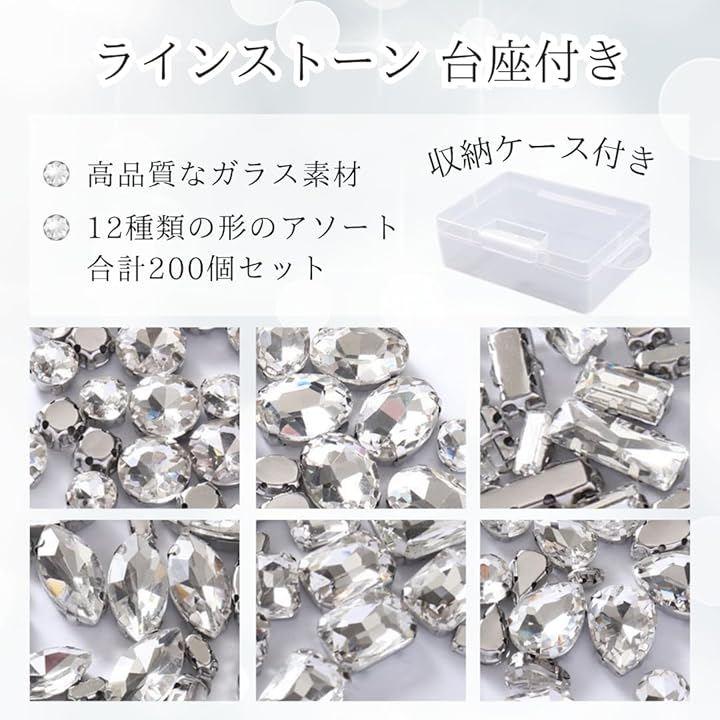 Sweet Plus「ラインストーン 台座付き ガラスストーン 透明 ビジュー 縫いつけられる 縫製用ラインストーン アソート しずく オーバル ドレス ジュエリー アクセサリー パーツ ケース付き(12種/合計200個)」キラキラと輝くガラス製のラインストーンが、ドレスやアクセサリーに華やかな印象をプラスします。
