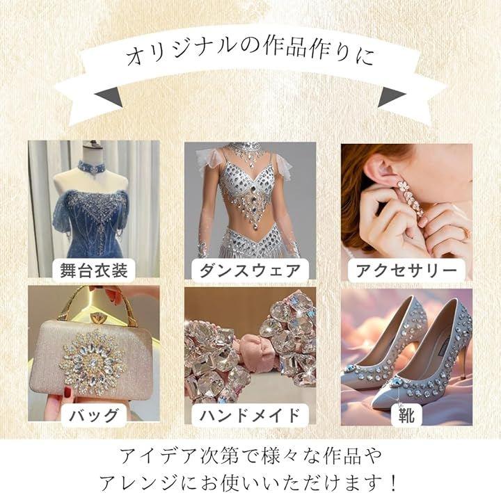 高品質なガラス素材を使用したラインストーンは、光の反射で美しく輝き、ドレスやアクセサリーを一層ゴージャスに演出します。