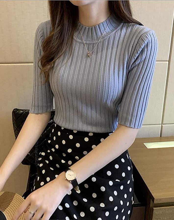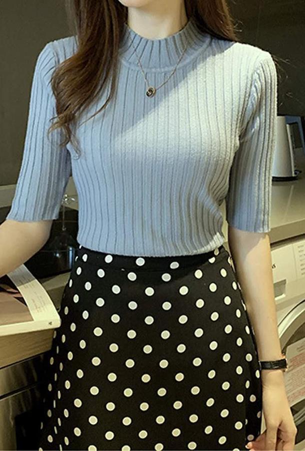 春夏秋冬オールシーズン着られる可愛い五分袖のリブトップス。