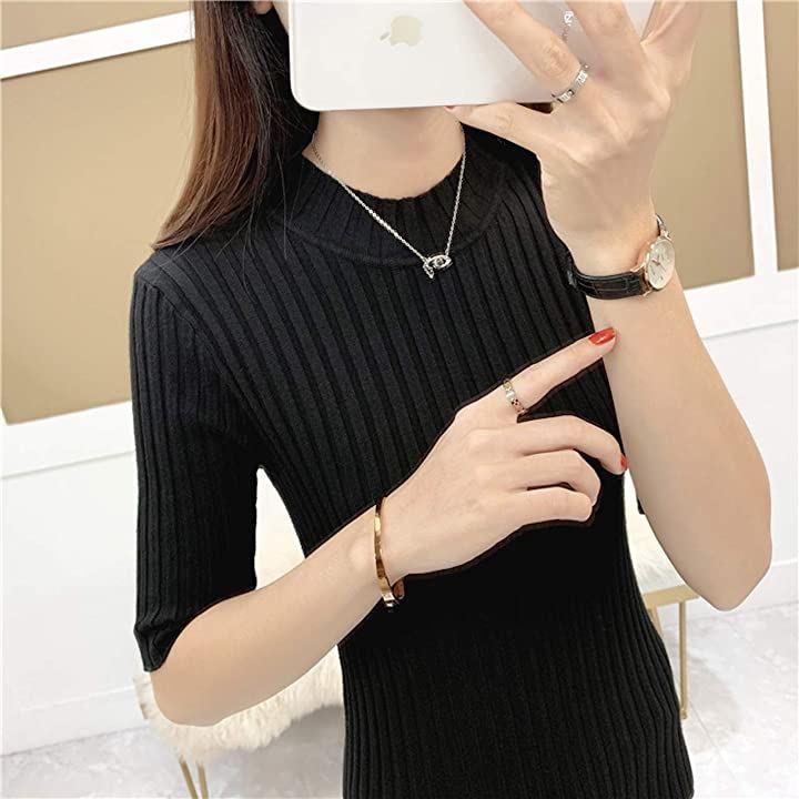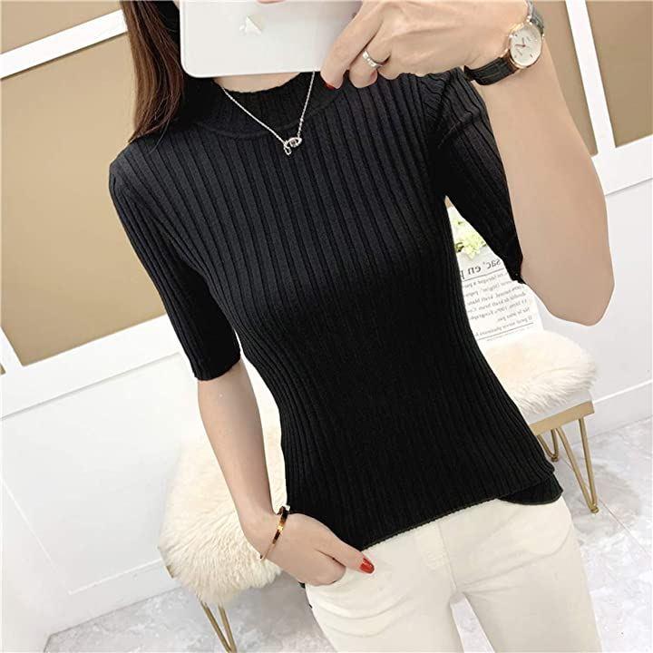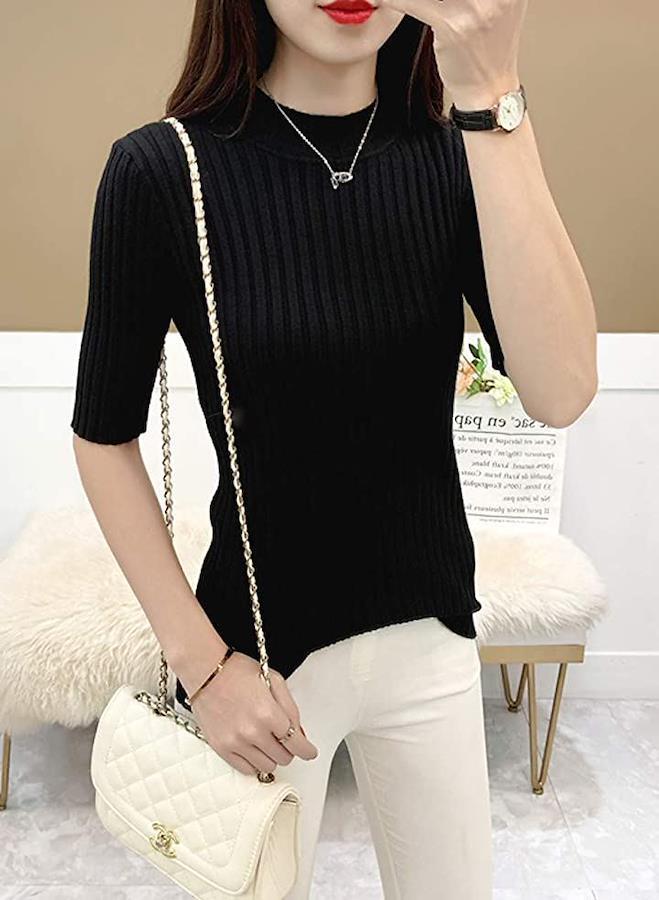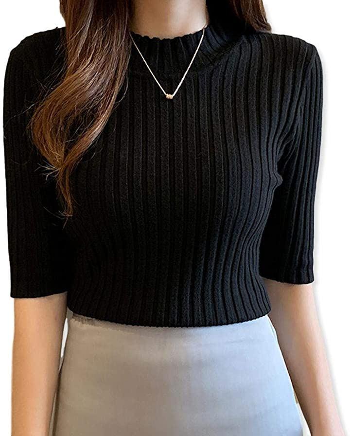 春夏秋冬オールシーズン着られる可愛い五分袖のリブトップス。