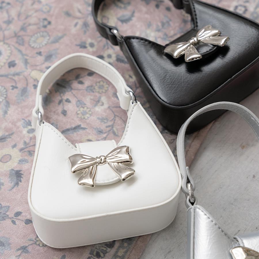 【コーディネート】メタリックなリボンが今年らしいデザインで、持つだけで旬顔コーデに♪定番のモノトーンをはじめ、トレンドのシルバーとガーリーさ高まるピンクの4色展開!フレンチガーリーはもちろん、今季マストなバレエコアスタイルをにもぴったりなアイテムです♪《生産国》中国