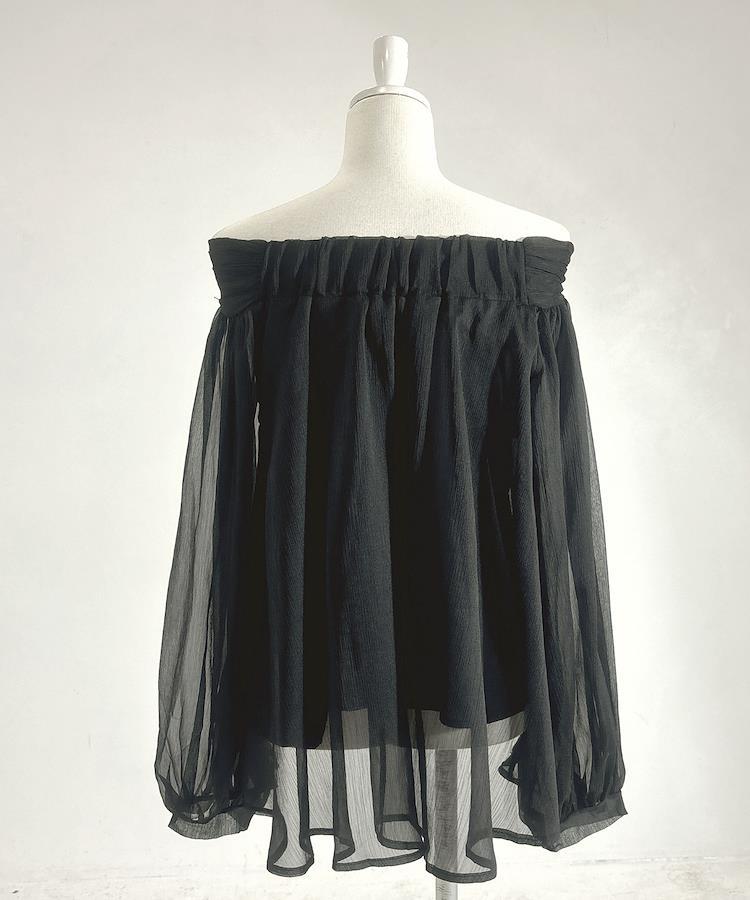 オフショルダーのデザインが特徴的で、肩を大胆に出すことで女性らしさを強調。