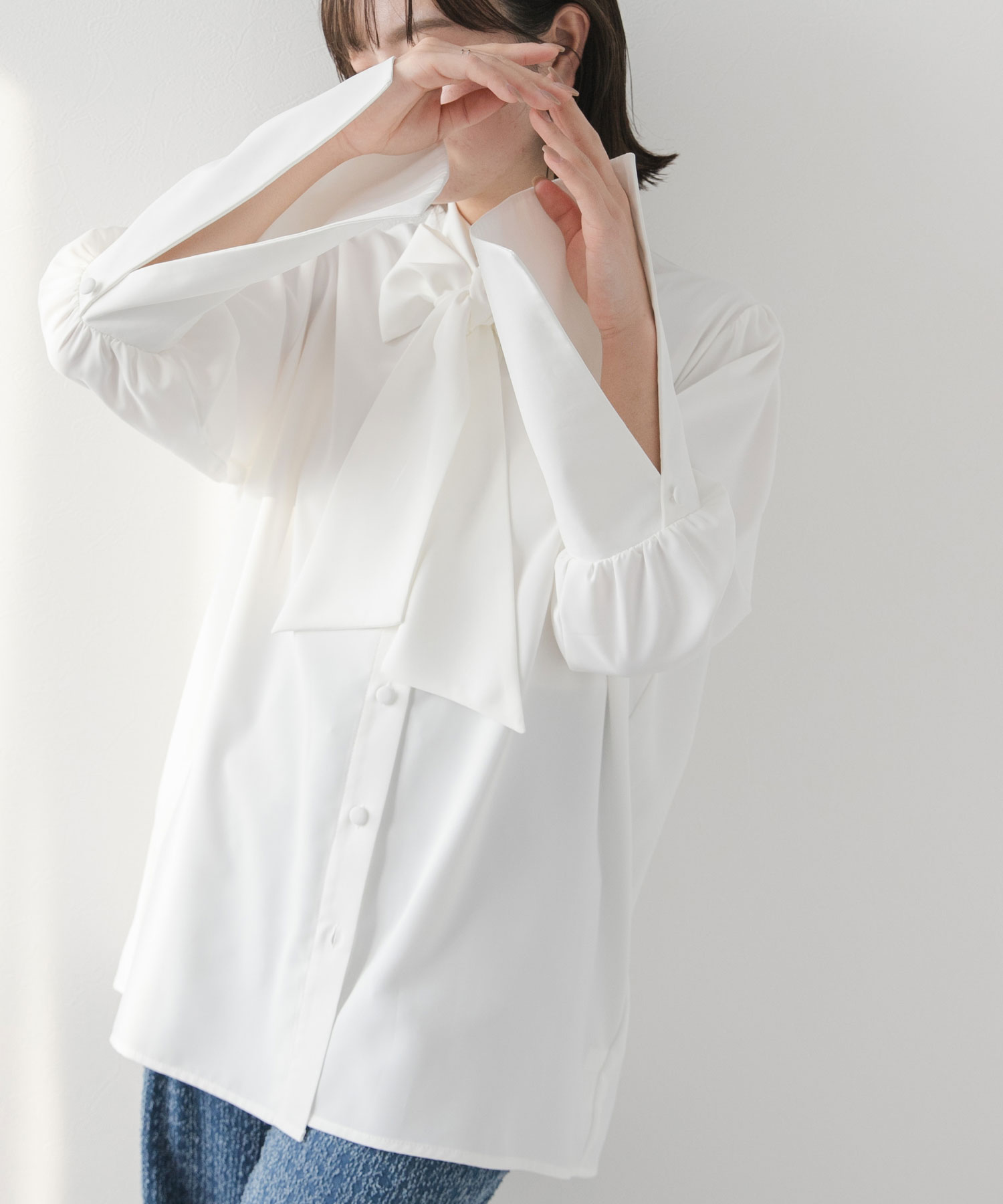 首元の大きめリボンがエレガントな印象をプラス。