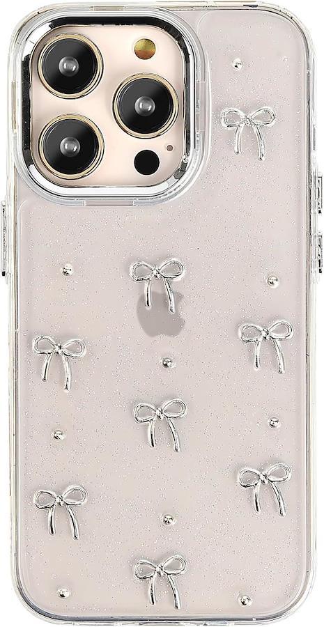 「可愛さと高級感を両立したリボン スマホケース」 シルバーの小さなリボンとパール、そしてキラキラと輝く控えめなラメが散りばめられた、上品で可愛らしいiPhoneケースが登場しました。