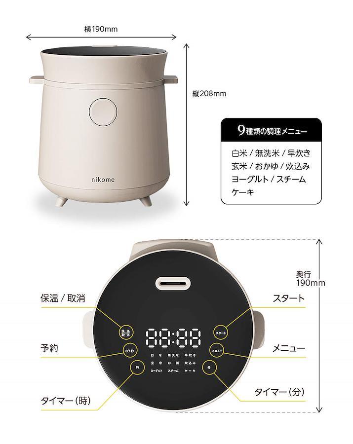 ●マルチな調理機能!全9種類●≪特長≫●・シンプルでおしゃれなデザインがご家庭のキッチン回りをおしゃれに楽しく演出!●・9つのモード(白米、無洗米、早炊き、玄米、お粥、炊き込み、スチーム、ヨーグルト、ケーキ)で炊く、煮る、蒸すなど調理機能充実。●・管理栄養士、フードコーディネーターの北嶋佳奈さんが監修するレシピブック付き。●・ひとり暮らしの方のファースト家電、ご家族がいるご家庭のセカンド家電として幅広く対応。●≪仕様≫●・定格:AC100V 50/60Hz●・消費電力:300W●・重量:約1.55kg●・コード長さ:訳1.1