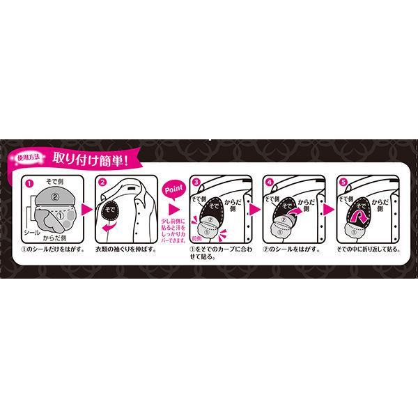 【使用方法】取り付け簡単!1.片方のシールだけをはがす。2.衣類のそでぐりを伸ばす。3.(1)をそでのカーブに合わせて貼る。Point:少し前側に貼ると汗をしっかりカバーできます。4.残りのシールをはがす。5.そでの中に折り返して貼る。
