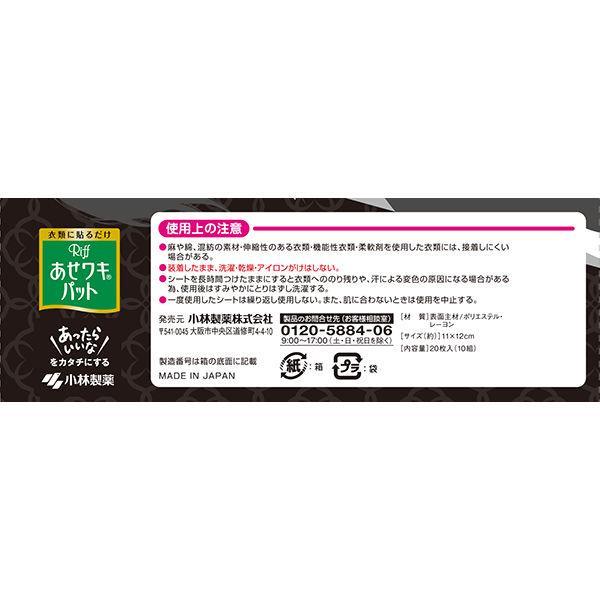 【注意】・麻や綿、混紡の素材・伸縮性のある衣類・機能性衣類・柔軟剤を使用した衣類には、接着しにくい場合がある。・衛生上および機能上、一度使用したシートは繰り返し使用しない。・使用中や使用後に肌に異常があらわれた場合は、使用を中止する。・万が一、使用後に衣類の表面に糊が残った場合は、そのまま洗濯したり、アイロンや乾燥機など、熱を加えない。★衣類への糊残りや衣類変色を防ぐため、次のことに注意して使用する。・シートは着用した当日中にとりはずす・とりはずす際はゆっくりと丁寧にはがす・シートを装着したまま洗濯しない・シートを装着する直前や装着したまま、アイロンや乾燥機など、熱を加えない
