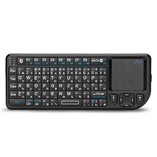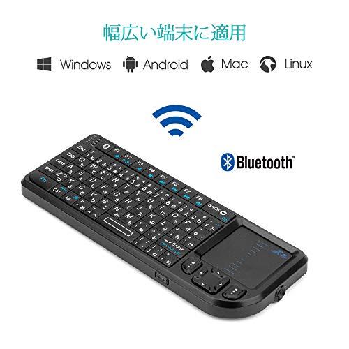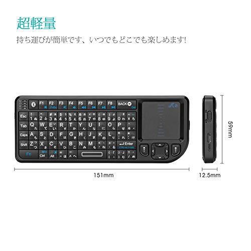 【Bluetooth + 2.4GHz ダブルモード】:キーボードでBluetoothドングルも付属ので、Bluetoothが搭載されないPC/パソコンも本キーボードと接続可能です。最新の2.4Gワイヤレス通信とBluetooth 4.0技術を採用して、より精確なトラッキングと迅速な反応を持ち、最大10mの操作距離を実現できます。PC、スマホ、スマートTVBOX、iPadまで幅広い端末に適用。電波法に基づく技術基準適合証明があります。【タッチパッド付き】:マウスがなくてもPCライクな快適操作!片手キーボード、リモコンとしても楽々。マウスと一体のワイヤレスキーボードなので、日常用やゲームコントローラーとして楽しめます。【超軽量】:本ミニキーボードが重さ100gで掌に相当するサイズ。スマホのようにパケットに入れてどこでもラクラク持ち運んでとても便利。ABSのボタン、UVの表面処理、手触りの良い。【日本語配列】:カナ印字の日本キーボード。多数のショートカットキーでスムーズなキーボード操作を実現。言語切り替え: 英語←→日本語(入力モード):Ctrl+Space; 英数←→ローマ字: caps; ご注意: かな入力とローマ字の切替は使用の端末より変更します Mac OS(Mac Book Air): Ctrl+Shift+[J]??平仮名あ; Ctrl+Shift+[J]??片仮名ア ; Ctrl+Shift+[;]??半角 A; Android(タブレット、スマホ)Shift+Space; lOS (タブレット、スマホ): Fn+Space; ご注意:上記のショットカットキーは弊社がテストした結果で 機種切や端末での設定により機能 しない場合がありますので、ご了承ください。【バックライト付き】:暗い場所でもくっきりと文字を視認でき、ごろ寝しながらも文字入力可能。長文のメールや文章作成などのミスタッチも軽減。