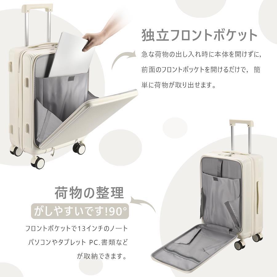 【スーツケース 機内持ち込み 製品の仕様】サイズ:全体外寸56cm x 36cm x 23cm 本体重量:約3.5kg容量:約41L。サイズは 機内持込みが可能な 。※寸法は手作業で計測しておりますので、1~3cmの誤差が生じる場合がございます。材質:ABS+PC(本体)、TPE(キャスター) 【スーツケース 機内持ち込み・フロントオープン&USB充電ポート付き】立てたまま荷物の出し入れができる便利なフロントオープンスーツケースです。15.6インチまでパソコンやタブレット、パスポートなど荷物に合わせた細かなポケットがあり、旅の途中でも、前ポケットから出したいものを簡単に取り出すことができ、子連れの方やビジネスシーンでも活躍しています。便利なUSB充電ポート付き、場所を選ばずいつでもどこでも移動しながら効率よく充電ができます。 【スーツケース 機内持ち込み・多段調節キャリバー&静音360度回転キャスター】ボールベアリング搭載のダブルホイールは、摩擦を軽減しスムーズな回転と安定性を保ちながら滑らかな動きで操作性は優秀です。また、アルミ合金製の伸縮ハンドルの位置をシームレスに調整でき、さまざまな体格の人に使いやすいスーツケース。さらに、使用時の音量は小さく、静音性に優れています。ガタガタした道でもこれといって負担なく動かすことができます。 【スーツケース 機内持ち込み・多機能で実用的なキャリーケース】シンプルなデザインかつ軽さと強さを両立した美しいボディで、手触りが良く、引き込み式ハンドルを採用することで、豊富な収納スペースを備えたモノなどが充実。荷物をかけられるフックは、荷解き不要なうえハンドルに袋や傘などの小物類を収納にも使いやすく、引っかけらるのは便利です。表面には細かな凹凸のシボ加工を施し、キズが目立ちにくいエンボス加工と 【スーツケース 機内持ち込み・安心のアフターサービス&1年間無料保証】は高品質を追求し、アフターサービスにも万全を期しています。通常使用において1年以内に不具合が生じた場合、無料で修理または交換いたします。万が一、初期不良が発生した場合は、迅速に新品と交換いたします。なお、商品画像と実物の色味は、お客様のデバイスや設定により若干異なる場合がありますので、予めご了承ください。