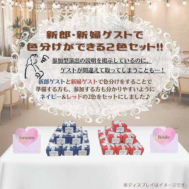 新郎・新婦のゲスト用にそれぞれ色分けができ、リボンも華やかなレッドとネイビーの2色セットです。