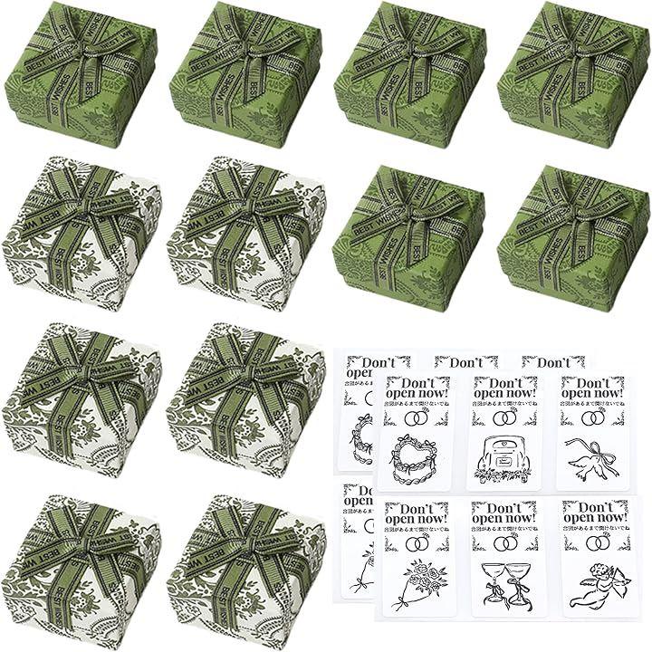 「商品仕様」BOXサイズ:約5cm角(高さ約3.5cm),BOX素材:紙,セット数:緑BOXx6個、白BOXx6個(計12個)、シール12枚付属