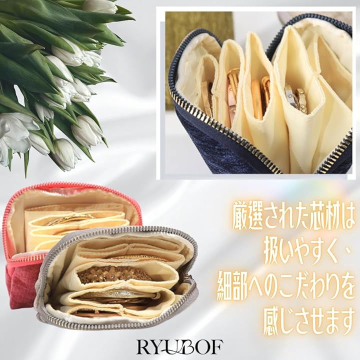 「ベルベット素材でやさしく保護」 やわらかいベルベット素材がジュエリーを傷や摩擦からしっかり守ります。