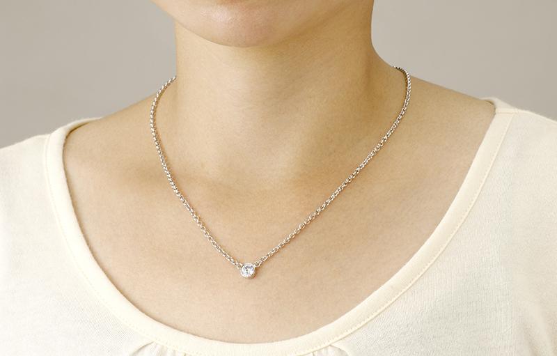 ★大粒キュービックジルコニアの輝きを人気の覆輪留めでセッティングしました。*1.4カラットのキュービックジルコニアを、ソフトな丸みで石を大きく見せる覆輪留めでセッティング、一粒ながら上品な存在感が有ります。*輝きをより引き立てる繊細なベルサーチェーンの磁気ネックレス。*身に着けたとき胸元で美しい「Vライン」になるエレガントな磁気ネックレス。*「覆輪留め」は、職人による手加工です。*石の周囲を筒状で留める台座、裏側も開いているので光をしっかり取り込んで美しく輝きます。ソフトな丸みの筒状の覆輪留めは石の前面をさらに大きく見せます。*150ミリテスラの磁力が肩のコリに働きかけます。