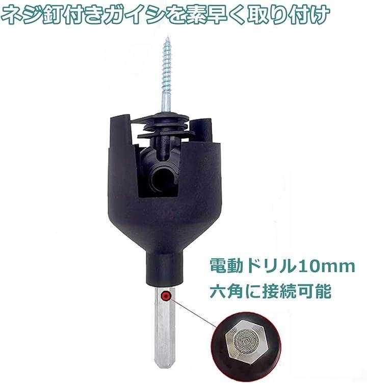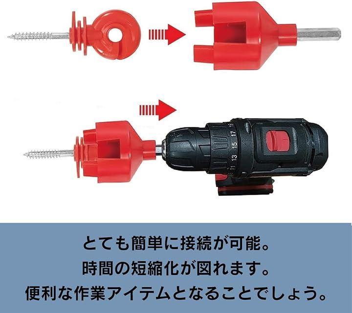 ドライバーや電動ドリルに取り付けて簡単にリング碍子を取り付ける作業ができるため、大量に電気柵を設置する際に非常に効率的に作業を行えます。