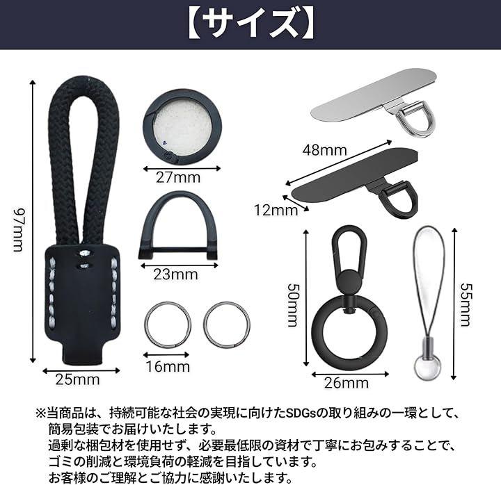 「製品仕様」サイズ:リングストラップ本体(長さ9.7cm)、重量:40g、カラー:ブラック、素材:レジンレザー、セット内容:リングストラップx1、接続用パーツ付属。