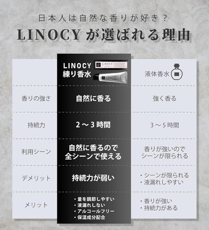 LINOCY(リノシー)は、さりげない香りを好む日本人向けに作られたMADE IN JAPANの練り香水です。