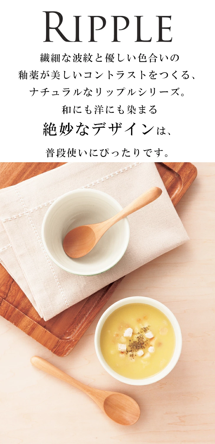 繊細な波紋と優しい色合いの釉薬が美しいコントラストをつくる、ナチュラルなリップルシリーズ。和にも洋にも染まる絶妙なデザインは、普段使いにぴったりです。