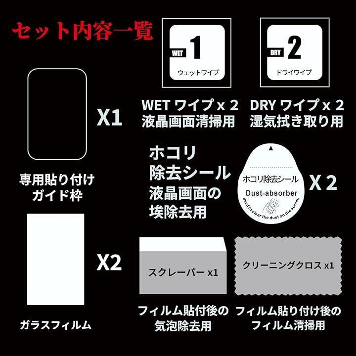 「セット内容」:ガラスフィルム x 2枚、かんたん位置合わせガイド枠 x 1個、 WETワイプ x 2枚、DRYワイプ x 2枚、ホコリ除去シール x 2枚、クリーニングクロス x 1枚、スクレーパー(ヘラ) x 1個。