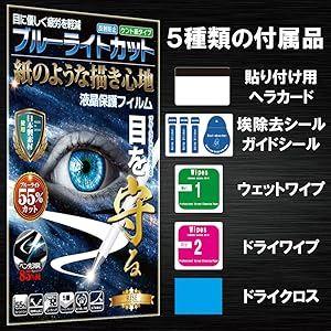 「商品仕様1」 日本製素材を使用、ブルーライトを最大で55%カット、反射防止加工、5層のハードコート設計、指紋軽減フッ素加工、貼り付けに便利な5種類の付属品、 クリーニングクロスx1、貼り付けヘラカードx1、ウェットクロスx1、ドライクロスx1、ホコリ吸着シートx1、及びパッケージ裏に印字されている貼付説明書が付属します。