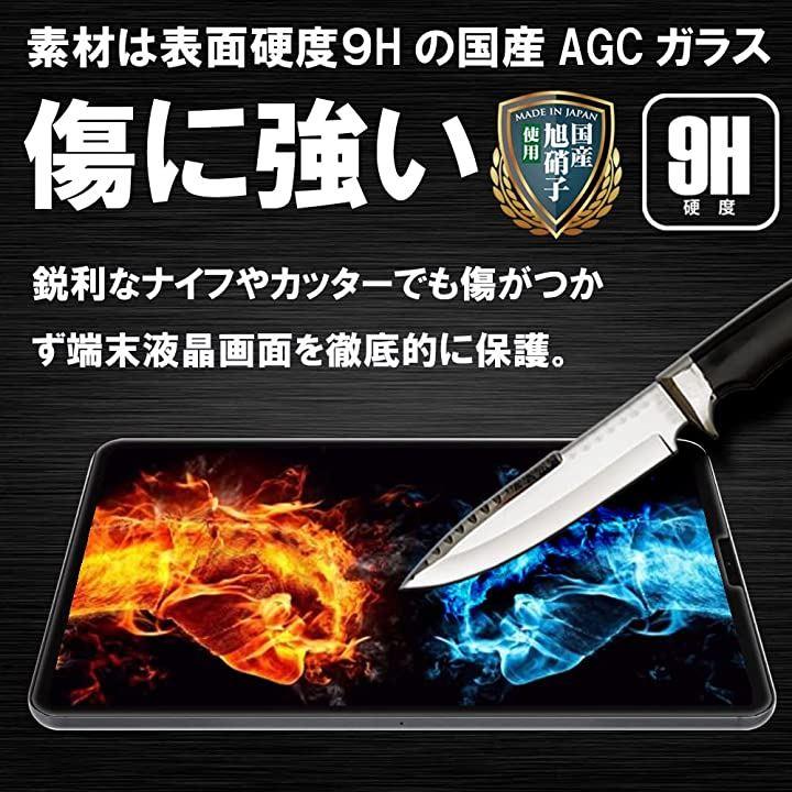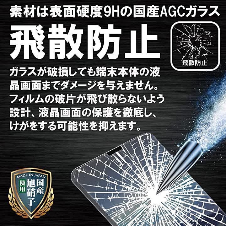 ・「高強度」5層のレイヤー加工で硬度9H、国産AGCガラスで、鋭利な傷から保護、飛散防止加工でガラスの飛び散りを防ぎ液晶破損とケガから保護。