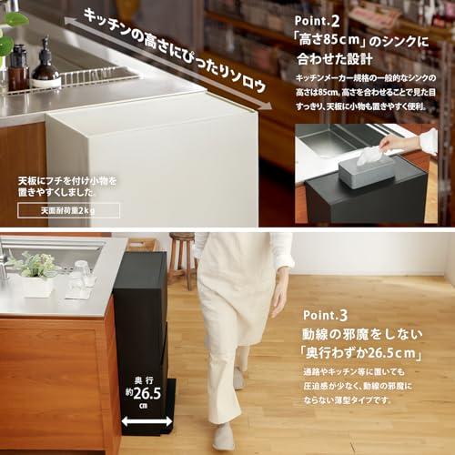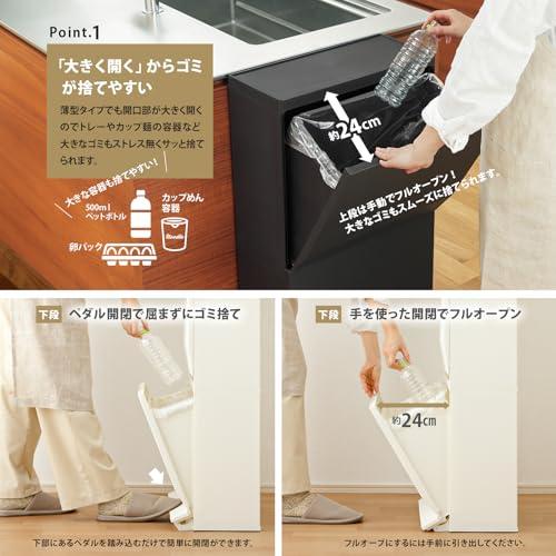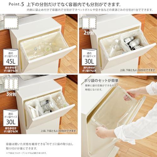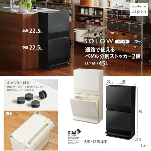 通路やキッチンに置いても邪魔にならない分別ストッカー。奥行きは本体部分で約22cm。ペダル部分を入れてもわずか約26.5cmの薄型スタイルで、壁際や通路に置いても人の動線を遮りません。下段はかがまなくても開けられるペダルオープン式。手を使わずに開くことができるので衛生的です。上段は手動オープン式。下段も手動でさらに大きく開くことができます。どちらもフルオープン時の開口部奥行はおよそ24cm。容器の奥までしっかり開き、かさばるものも入れやすい仕様。フルオープン状態は維持でき、袋の付け外しもしやすくなっています。容器フチの切れ込みを使って2分割~3分割可能。容器内でさらに分別することができます。※容量は上下各約22.5Lですが、ポリ袋はそれぞれに45L(容器内で分割する場合は30L)の袋をご使用ください。高さは一般的なキッチンの高さに合わせた約85cm。天板はフチがわずかに立ったトレー形状で小物などを置くことができます(耐荷重2kg)。調理小物のちょっと置きにも便利です。抗菌加工を施しているので清潔。日用品のストッカーとしてもお使いいただけます。開口部が広いので、かさばるものの出し入れも簡単。トイレットペーパーなどのストックやタオルなどの収納にもおすすめです。移動に便利なキャスター付き。[サイズ]約45×26.5×高さ85cm(ペダル部含む)[容量]約45L[重量]約4.68kg[素材・材質]ポリプロピレン[付属品]キャスター×4個[生産国]日本 【サイズ】約45×26.5×高さ85cm(ペダル部含む) 【重量】約4.68kg 【容量】約45L 【素材・材質】ポリプロピレン 【生産国】日本 通路やキッチンに置いても邪魔にならない分別ストッカー。 奥行きは本体部分で約22cm。ペダル部分を入れてもわずか約26.5cmの薄型スタイルで、壁際や通路に置いても人の動線を遮りません。 下段はかがまなくても開けられるペダルオープン式。手を使わずに開くことができるので衛生的です。 上段は手動オープン式。下段も手動でさらに大きく開くことができます。 (#lf)(#lf)(#lf)商品購入前に、ストア紹介ページをご確認ください。