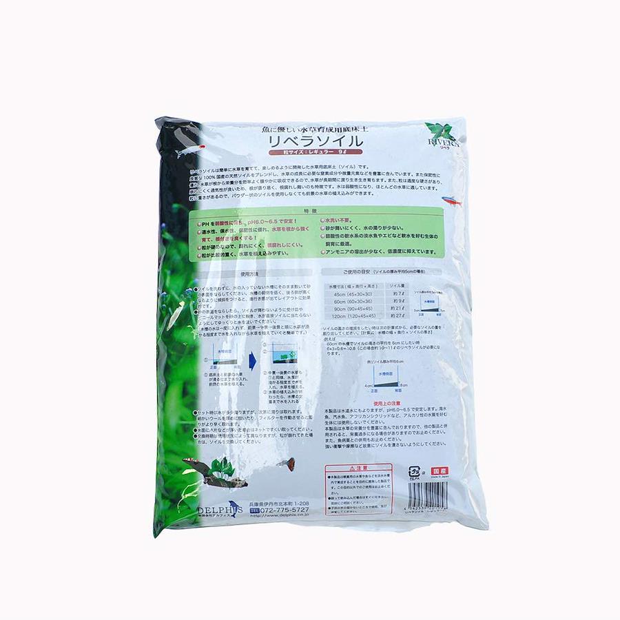 リベラソイルは簡単に水草を育てて、楽しめるように開発した水草用底床土(ソイル)です。 良質な100%国産のソイルをブレンドし、水草の成長に必要な窒素成分や微量元素などを豊富に含んでいます。 また保肥製に優れ、水草が根から栄養分を効率よく穏やかに吸収できるので、水草が長期間に渡り生き生き育ちます。 また、粒は適度な硬さがあり、崩れにくく通気性が良いため、根が張り易く、根腐れし難いのも特徴です。水は弱酸性になり、ほとんどの水草に適しています。粒に重さがあるので、パウダー状のソイルを使用しなくても前景の水草の植え込みができます。 ●内容量 9リットル