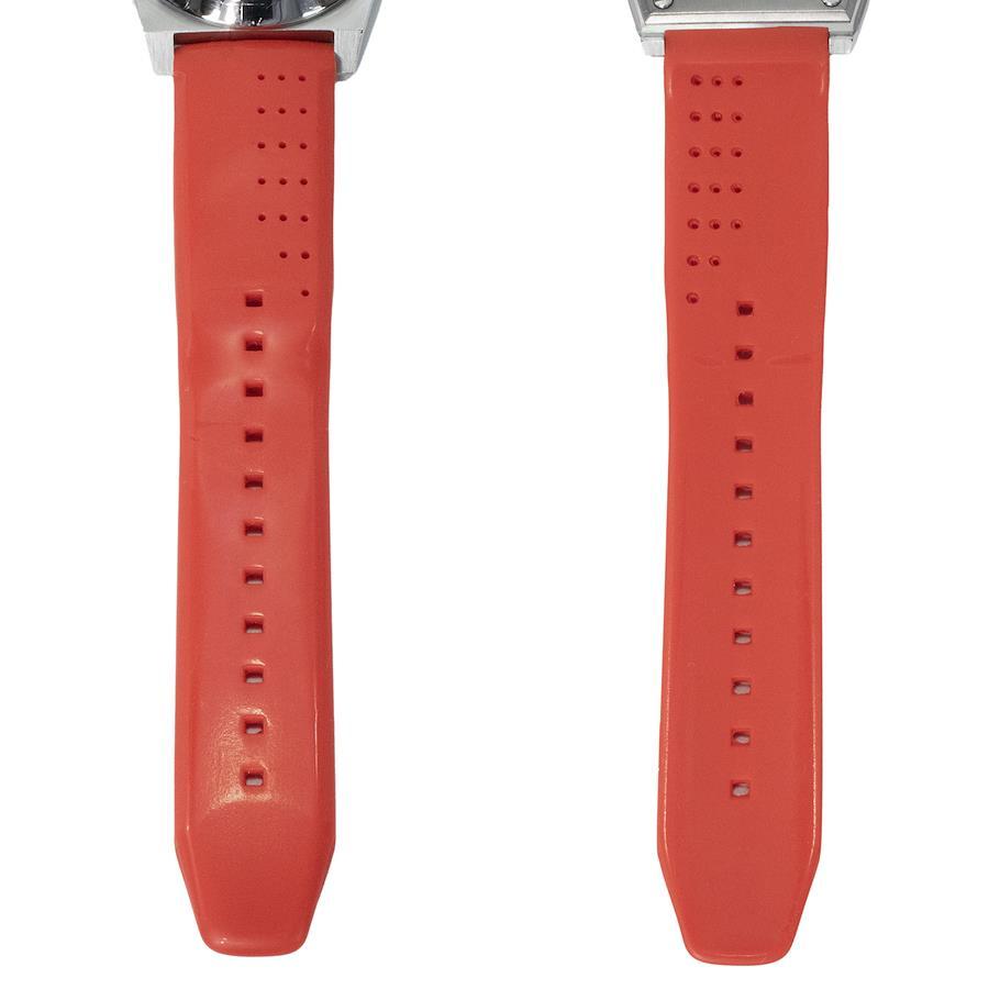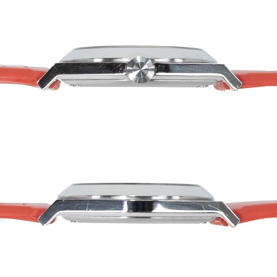 清潔感のあるホワイトの文字盤に、鮮やかなレッドのインデックスやベルトが映える、大胆なデザインが魅力でございます。