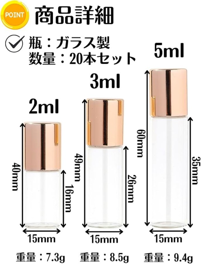 「商品詳細」容量:3ml (底直径15mmx高さ49mm)、本体:20本、瓶材質:ガラス