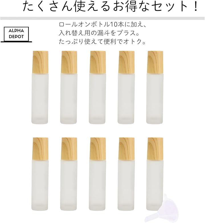 「たっぷり10本&漏斗付き」10本のロールオンボトルに漏斗もセット。詰め替えもラクラク。