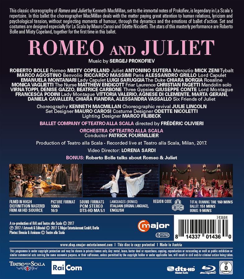 This classic choreography of Romeo and Juliet by Kenneth MacMillan, set to the immortal notes of Prokofiev, is legendary in La Scala´s repertoire. In this ballet the choreographer MacMillan deals with the matter paying great attention to human relations, lyricism and psychological tension, without neglecting moments of humour, through the dynamics and the emotions of ballet d'action. Set and costumes are designed especially for La Scala by Mauro Carosi and Odette Nicoletti. The stars of this masterly performance are Roberto Bolle and Misty Copeland, together for the first time in this ballet. Iconic ballerina Misty Copeland makes history as the first African American Female Principal Dancer with the prestigious American Ballet Theatre. As a bonus, this release also includes an exciting feature: Roberto Bolle talks about Romeo & Juliet