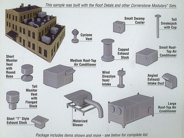 Roof Details建物の屋上を惹きたてる、排気口や換気ダクト、エアコンの室外機など小物のセットです。材質:プラスチック※建物は付属しません。