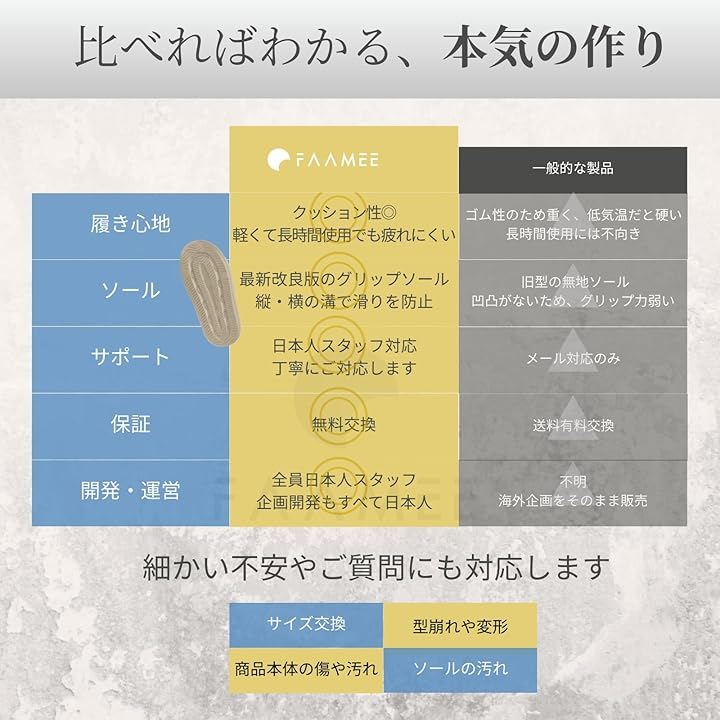 * ゴムのように柔らかいのに、とても軽い * 水・薬品・湿気に強くて、劣化しにくい * 寒い季節でも固くなりにくいからクッション性が続く だからこそ、家で毎日履くスリッパとの相性がすごくいい素材です。