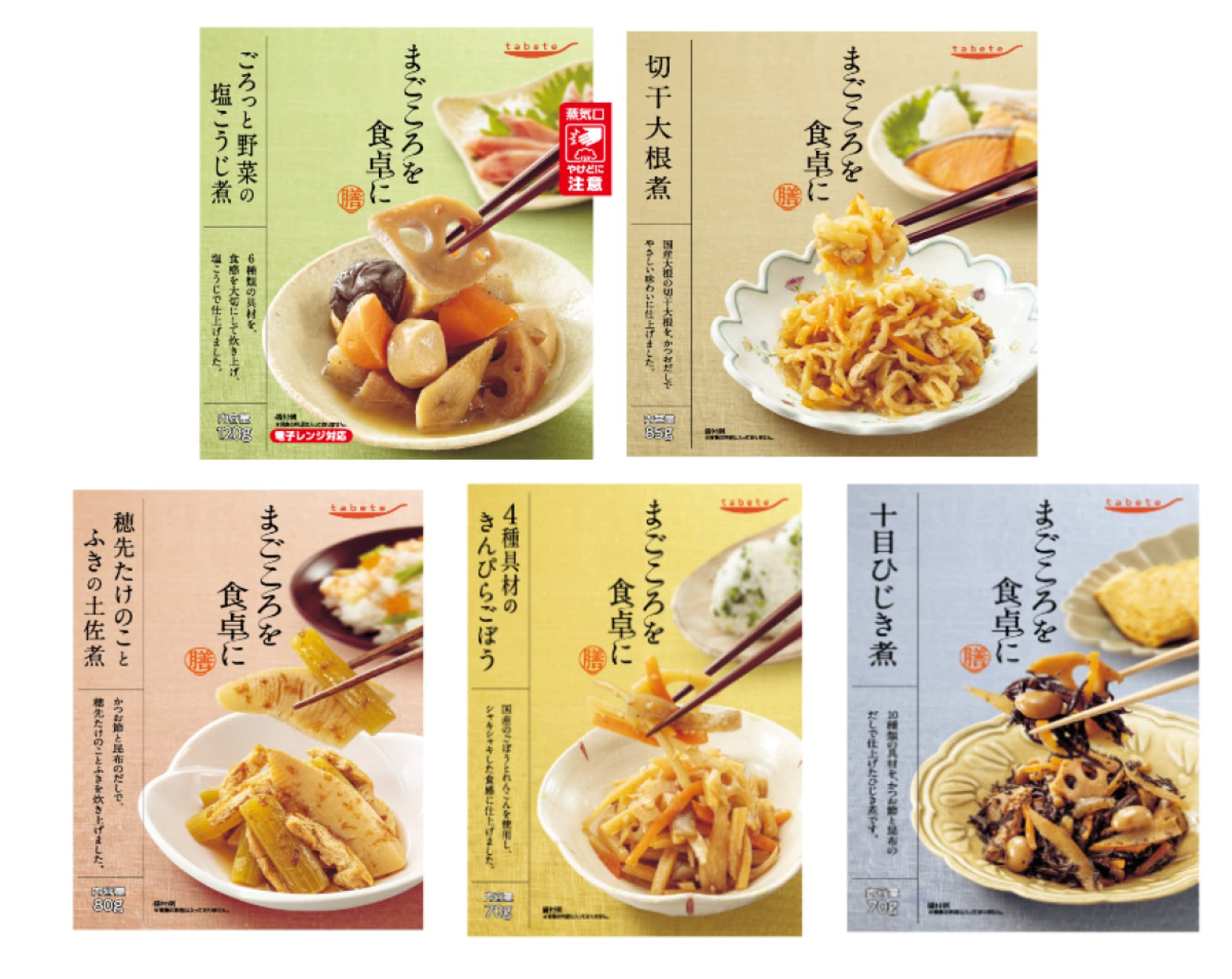 【穂先たけのことふきの土佐煮】たけのこ水煮(たけのこ(中国))、ふき水煮、油揚げ、しょうゆ、砂糖、みりん、米発酵調味料、かつお削り節、かつお節エキス、かつお節、昆布、食塩/豆腐用凝固剤、(一部に小麦・大豆を含む)【十目ひじき煮】ひじき(中国、韓国)、大豆、加工にんじん、砂糖、しょうゆ、ごぼう、乾しいたけ、加工れんこん、鶏肉、ぶどう糖果糖液糖、たけのこ水煮、植物油脂、こんにゃく、たん白加水分解物、油揚げ、みりん、かつお節、昆布、昆布エキス、食塩/水酸化Ca、豆腐用凝固剤、(一部に小麦・大豆・鶏肉を含む)【ごろっと野菜の塩こうじ煮】こんにゃく(韓国製造)、加工れんこん、さといも、にんじん、ごぼう、しいたけ水煮、しょうゆ、米発酵調味料、砂糖、ぶどう糖果糖液糖、塩こうじ、チキンエキス、かつお節エキス、醸造酢、食塩/水酸化Ca、酸化防止剤(ビタミンC)、(一部に小麦・大豆・鶏肉を含む)【4種具材のきんぴらごぼう】ごぼう(国産)、れんこん、こんにゃく、しょうゆ、にんじん、かつおだし、水あめ混合ぶどう糖果糖液糖、砂糖、還元水あめ、ごま油、米酢、ごま/ph調整剤、水酸化Ca、(一部に小麦・ごま・大豆を含む)【切干大根煮】切干大根(大根(国産))、にんじん、油揚げ、しょうゆ、かつおだし汁、砂糖、清酒、発酵調味料、酵母エキス、なたね油/豆腐用凝固剤、(一部に小麦・大豆を含む)