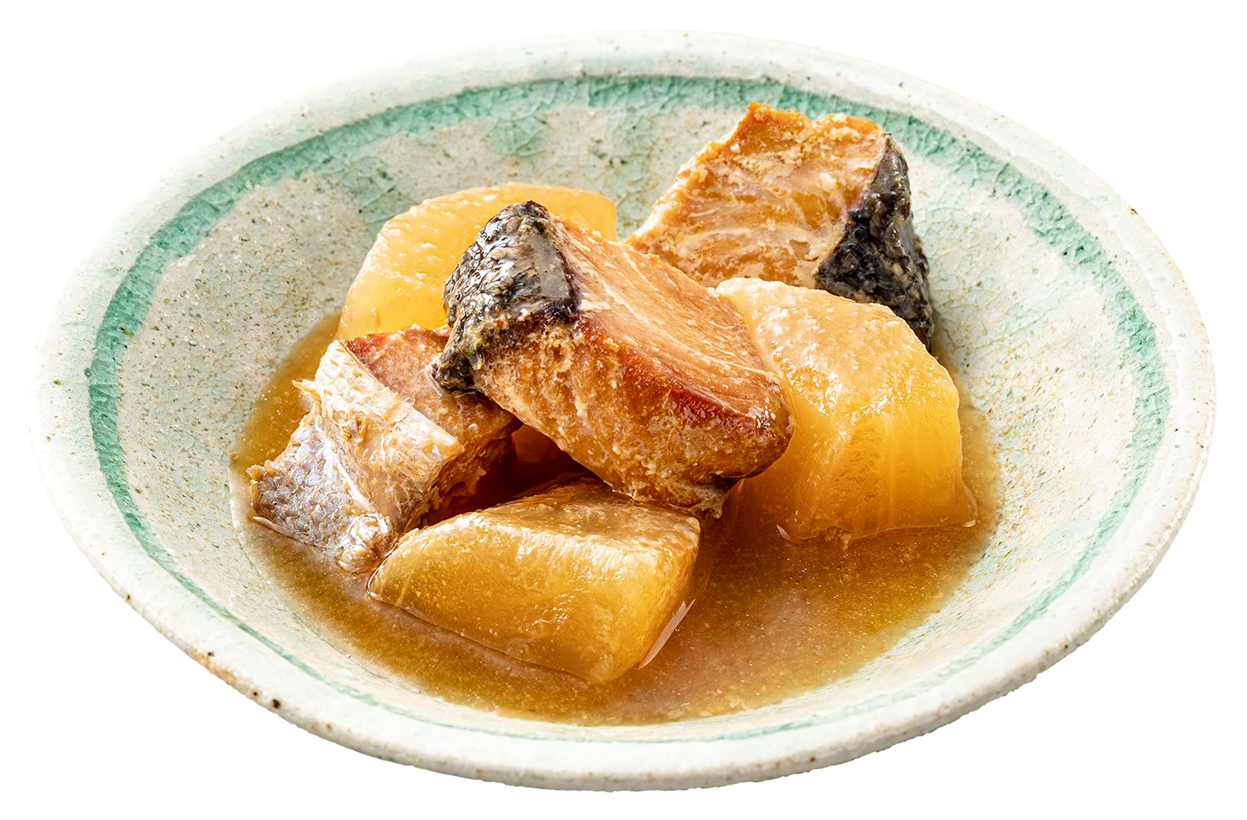 ぶり(国産)、大根、発酵調味料、しょうゆ、砂糖、還元水あめ、しょうがペースト、こんぶエキス、食塩、かつお節エキス/乳酸カルシウム、増粘剤(キサンタンガム)、(一部に小麦・大豆を含む)