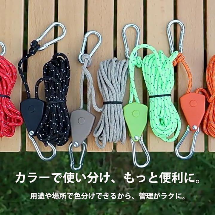 商品仕様 ・内容:ロープラチェットx4個 ・ロープ長:約4m ・ロープ径:約4mm ・耐荷重:約68kg ・カラー:カーキ/グリーン/オレンジ/ブラック/レッド キャンプやバーベキュー、フェス、ピクニック、車中泊、DIYなどあらゆるシーンで役立つ万能ギア。