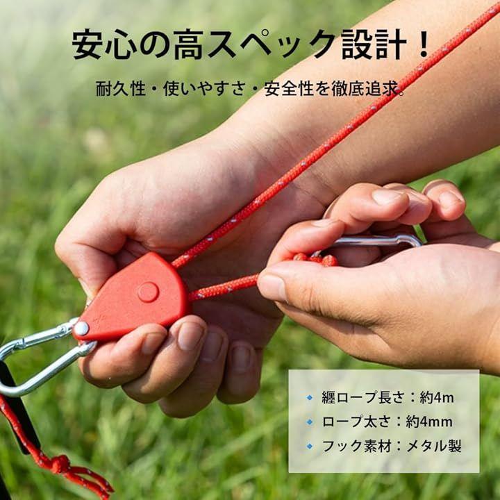この「ロープラチェット 4個セット」は、テントやタープの設営を誰でもスムーズに行える便利なアイテムです。
