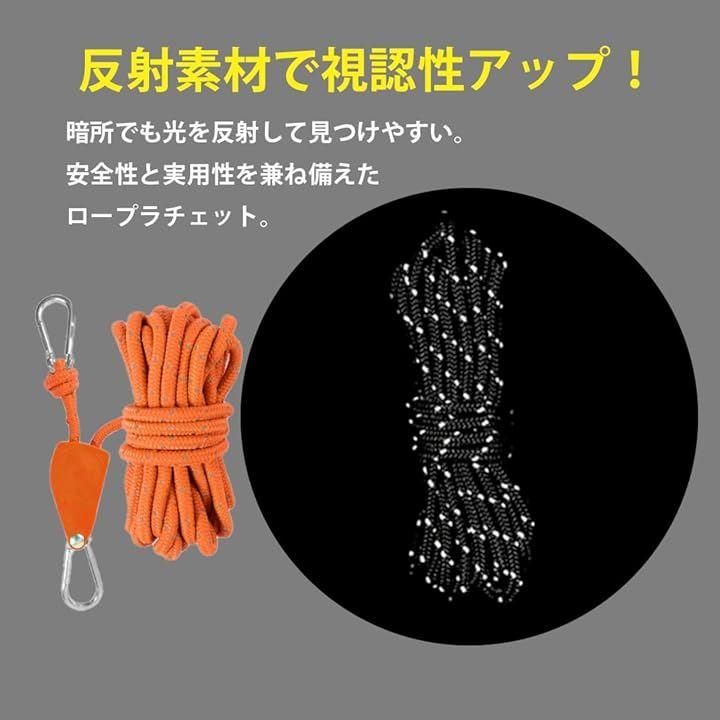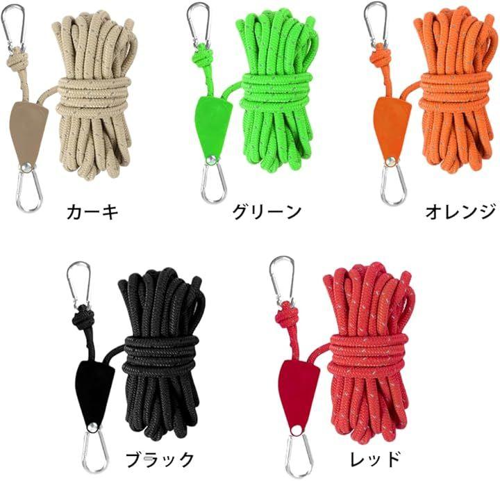 商品仕様 ・内容:ロープラチェットx4個 ・ロープ長:約4m ・ロープ径:約4mm ・耐荷重:約68kg ・カラー:カーキ/グリーン/オレンジ/ブラック/レッド キャンプやバーベキュー、フェス、ピクニック、車中泊、DIYなどあらゆるシーンで役立つ万能ギア。