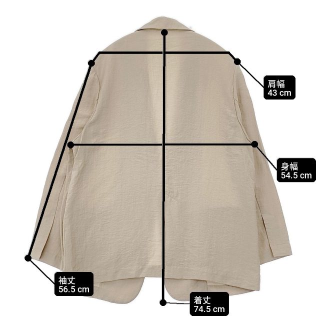 | 実寸サイズ | 肩幅:約43cm 着丈:約74.5cm 身幅:約54.5cm 袖丈:約56.5cm ※採寸画像がある商品はハンガーに吊るした状態での計測のため、平置きでの採寸とは差が生じる場合がございます。平置きでの実寸サイズをご希望の場合は、ご購入前に必ずご質問ください。 ※記載以外のサイズが合わないことを理由とした返品はできませんので、 記載部分以外で実寸サイズの気になる箇所があれば必ず購入前にご質問ください。 |