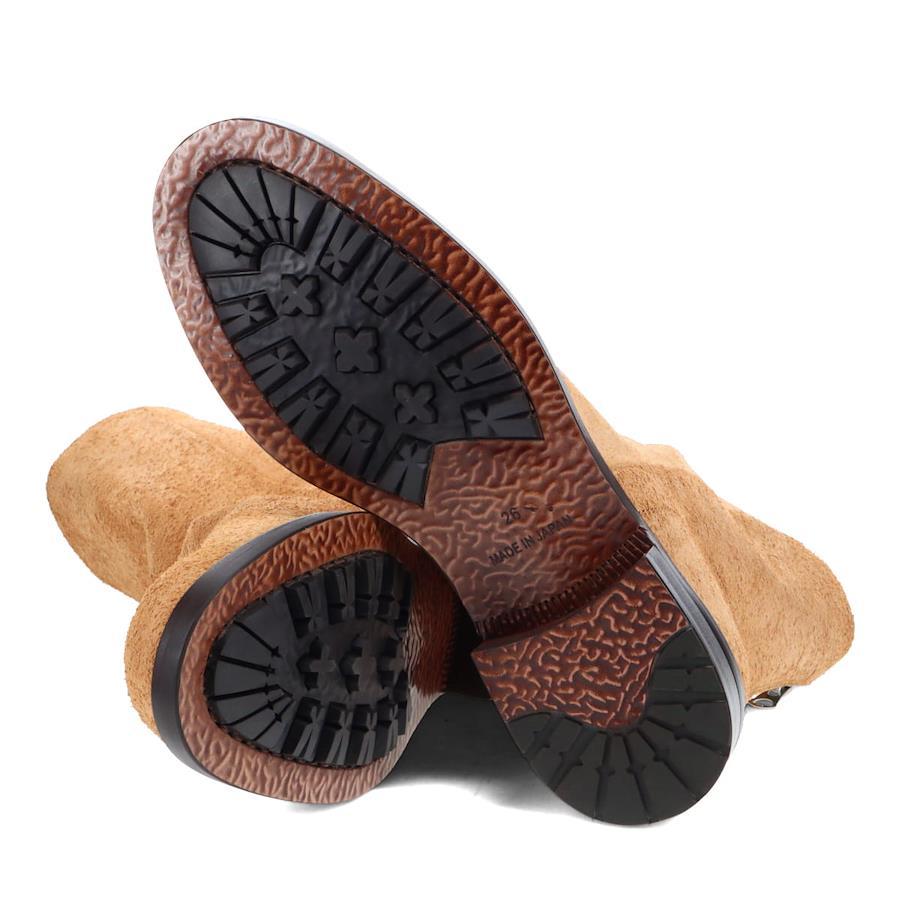 筒周りを斜めに長く取ったシルエットは履くと甲にシワが入りモードクラシックやトラッドにも履きこなせるロングブーツ。